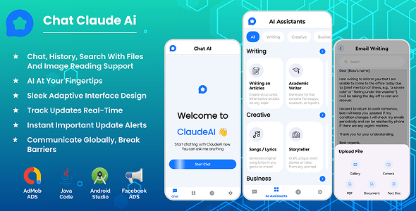 ChatAi Claude app lets you experience smart conversations powered by Claude AI. Start new chats, upload images from your gallery or capture with the camera to describe or extract text, and even upload PDF, DOC, or TXT files for the AI to read. You can also use voice-to-text to give commands easily.