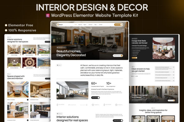 Decori – Interior Design & Home Decor Elementor Template Kit is a clean and modern Elementor Template Kit designed for interior designers, home décor studios, architects, and renovation professionals. The layout focuses on clarity, spacing, and visual balance to present projects and services in a calm, premium way that builds trust from the first visit.