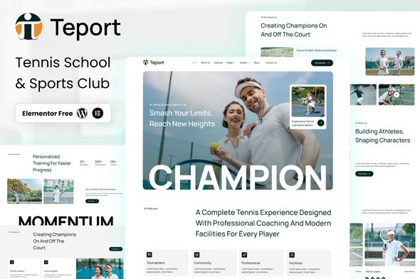 Teport – Tennis School & Sports Club Elementor Template Kit Teport is a dynamic and modern Elementor Template Kit created for tennis schools, sports academies, and athletic clubs. Designed with energy and professionalism, Teport helps you build a vibrant online presence to showcase training programs, schedules, memberships, and events with style.